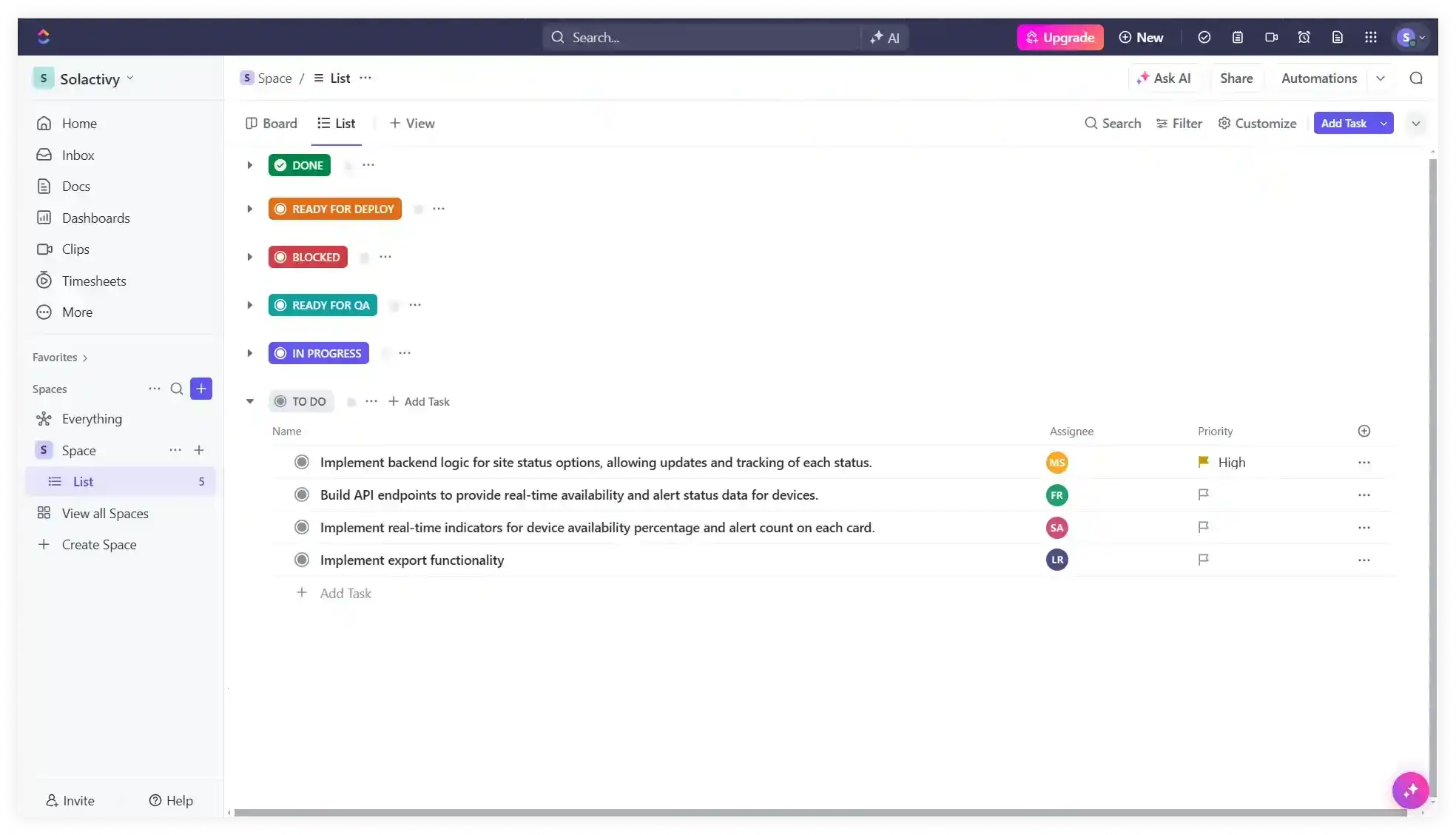 - We linked up a ClickUp board where we moved along all the tasks in their workflow and provided an overall road map to track it against progress.